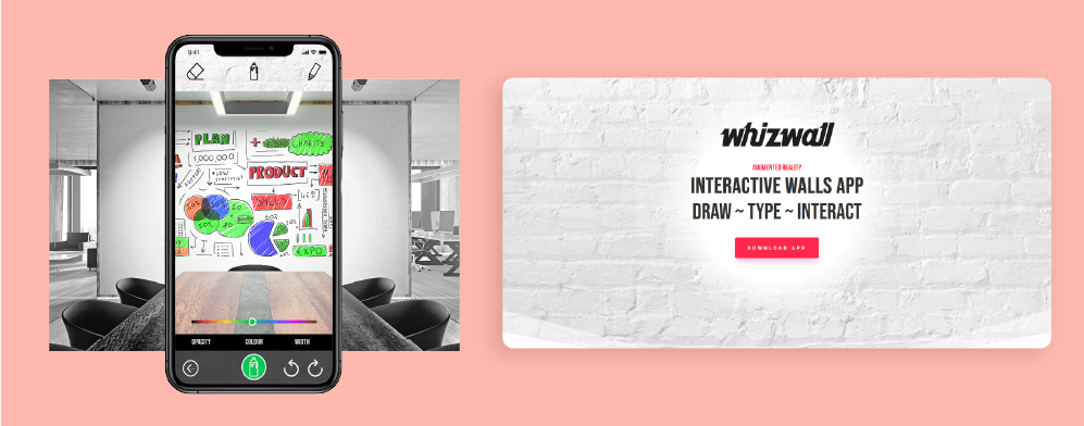 Whizwall's technology merges interactive whiteboards, touchscreens, and online collaboration software, using augmented reality (AR) to enable real-time collaboration on a virtual whiteboard. The WhizWall app allows you to unleash your creativity by using augmented reality walls as a canvas for drawing, typing, and creating. Your mobile device transforms into an air mouse, allowing you to express yourself on a larger scale.